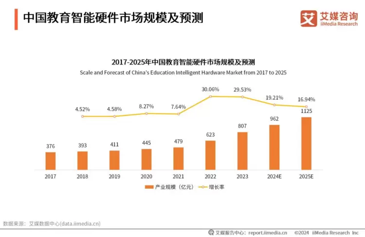 艾媒咨询新近发布的《2024-2025年中国智能学习机市场趋势研究报告》显示,2017-2023年中国教育智能硬件市场规模整体呈现上升趋势,2023年中国教育智能硬件市场规模达807亿元,同比增长29.53%,预计2025年中国教育智能硬件市场规模超1000亿元。