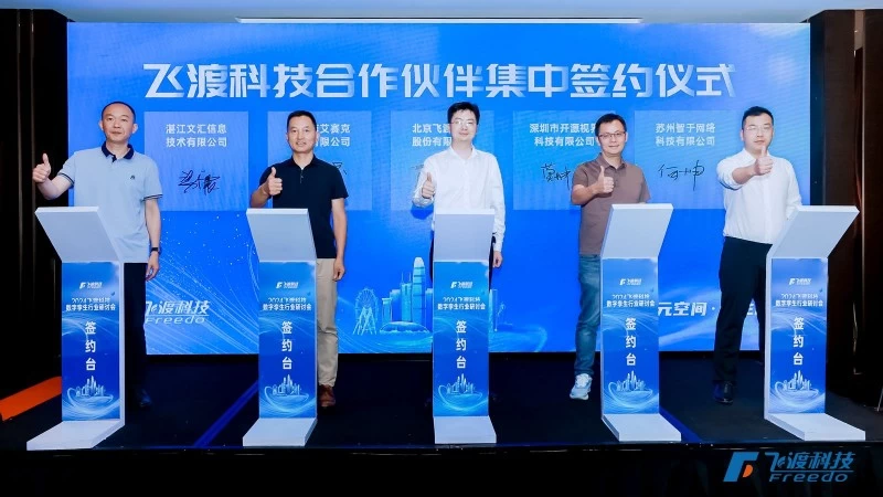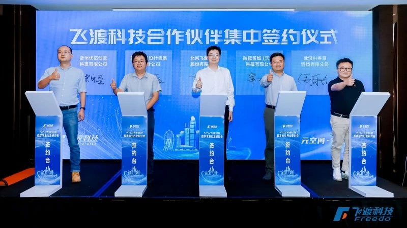 现场,飞渡科技分别与湛江文汇信息技术有限公司、深圳市艾赛克科技有限公司、深圳市开源视界科技有限公司、东营智于网络有限公司、贵州优拓创景科技有限公司,航天规划设计集团海南分公司、融慧智城(天津)科技有限公司、武汉科莱慧科技有限公司签署战略合作协议,旨在促进双方优势互补,实现资源优化配置,共同为加快数字孪生产业落地、协同创新,推动技术与行业场景深度融合,共建数字孪生行业未来而努力。
