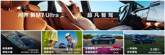 问界新M7 Ultra搭载的HUAWEI ADS 2.0高阶智能驾驶系统,无论是在复杂的城市街道还是高速公路上,都能为驾驶员提供可靠的帮助,让驾驶轻松省心。192线激光雷达具备的超高清、超远距等特点,能够为车辆提供更为准确、全面的环境感知信息,实现路口转弯对行人识别、倒地行人识别等多场景的识别,从而做出更加准确的驾驶决策,结合HUAWEI ADS 2.0全场景感知能力,让智驾系统拥有强大的适应性和稳定性,带来更加安全、可靠的驾驶保障,真正实现“全国都能开、越开越好开”的出行体验。截至2024年5月,HUAWEI ADS 2.0高阶智能驾驶系统持续进化,城区NCA领航已覆盖全国超过40,000+城乡镇,智驾总里程达2.2亿公里,云端学习训练算力提升至3.5E FLOPS。