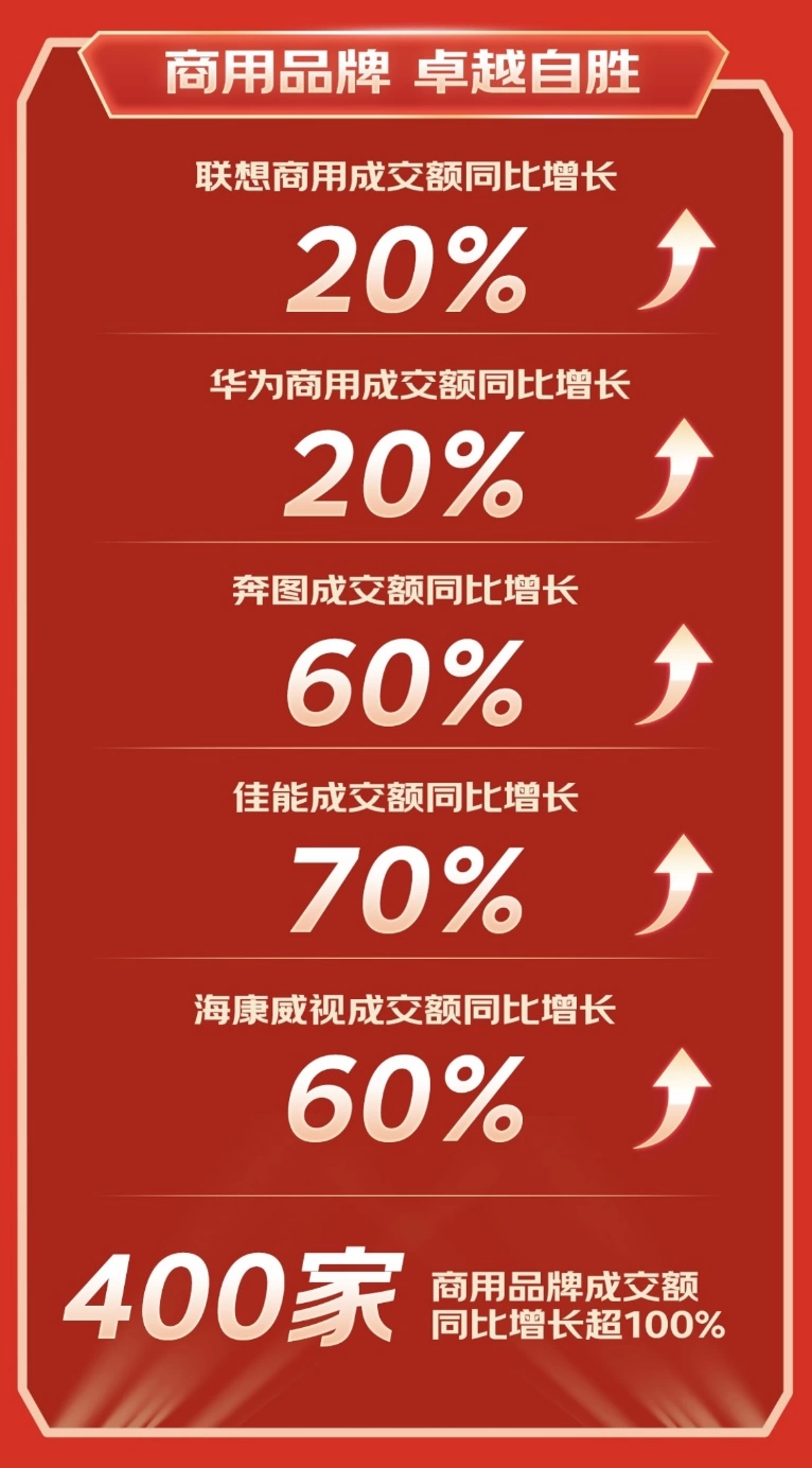 诸多品质值得信赖的3C数码大牌齐聚京东,带来了海量物美价优的产品,充分点燃了客户的采购热情,各大品牌纷纷收获了增长。战报数据显示,联想商用成交额同比增长20%;华为商用成交额同比增长20%;奔图成交额同比增长60%;佳能成交额同比增长70%;海康威视成交额同比增长60%;有400家商用品牌成交额同比增长超100%。