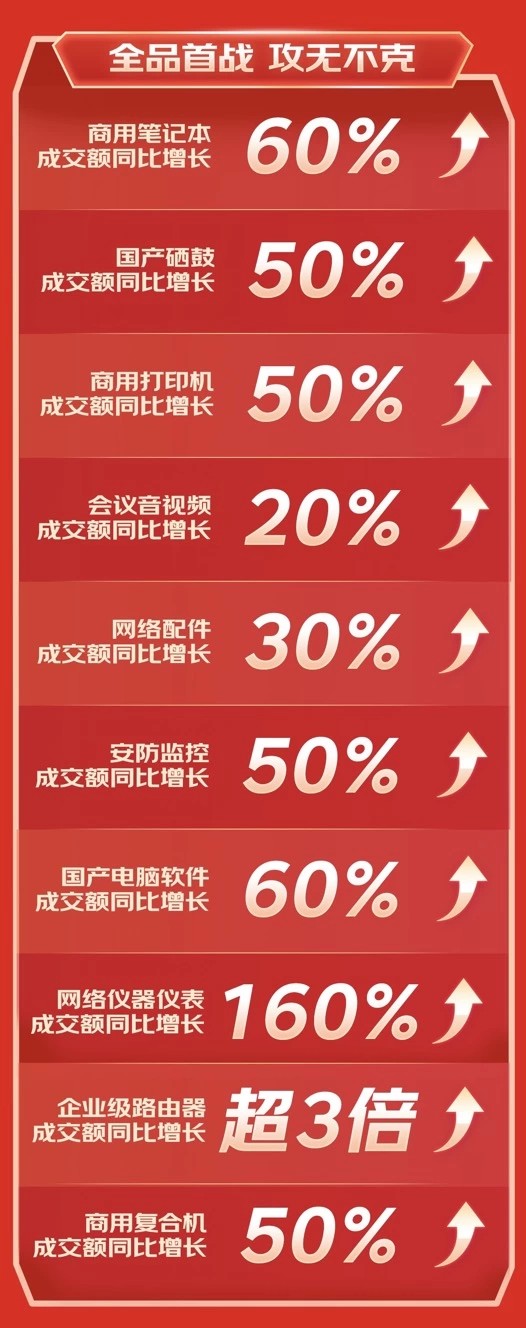 作为生产经营中不可或缺的生产力工具,电脑软件、笔记本等3C数码品类是采购名单上的重点品类,采购需求也日益飙升。战报数据显示,商用笔记本成交额同比增长60%;国产硒鼓成交额同比增长50%;商用打印机成交额同比增长50%;会议音视频成交额同比增长20%;网络配件成交额同比增长30%;安防监控成交额同比增长50%;国产电脑软件成交额同比增长60%;网络仪器仪表成交额同比增长160%;企业级路由器成交额同比增长超3倍;商用复合机成交额同比增长50%;各品类均收获了强劲增长。