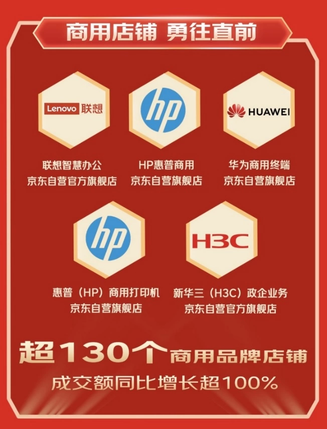 各3C数码品牌京东自营旗舰店也凭借品质过硬的产品以及省心服务,取得了不俗成绩。战报数据显示,超130个商用品牌店铺成交额同比增长超100%;其中,联想智慧办公京东自营官方旗舰店、HP惠普商用京东自营旗舰店、华为商用终端京东自营旗舰店、惠普(HP)商用打印机京东自营旗舰店以及新华三(H3C)政企业务京东自营官方旗舰店,均取得亮眼的成绩。