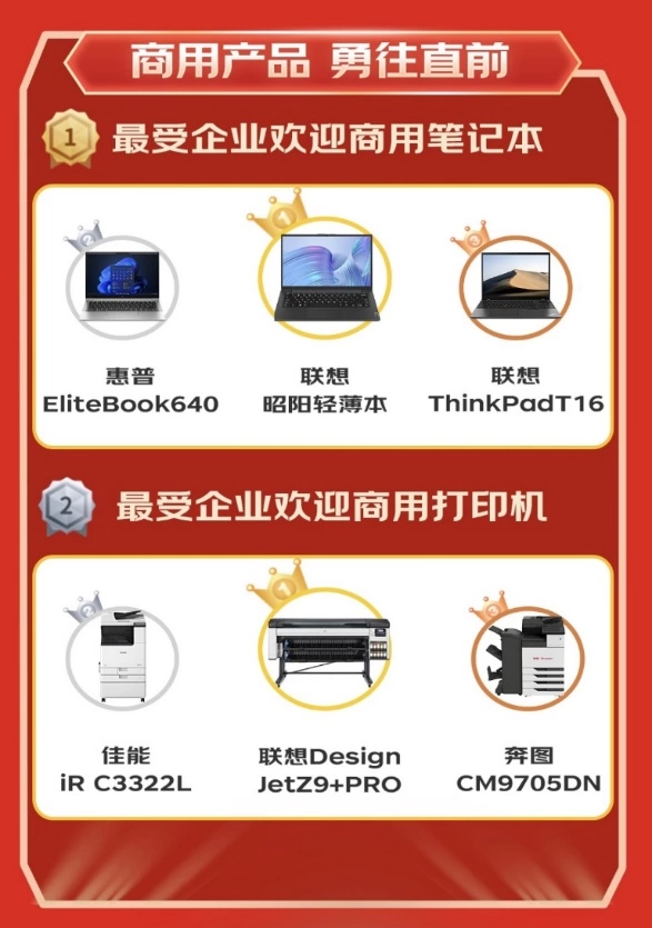 从战报中可以看到,今年京东618也涌现出了一大批深受客户喜爱的爆款产品。联想昭阳轻薄本成为最受企业欢迎的商用笔记本,惠普EliteBook 640笔记本及联想ThinkPad T16笔记本受欢迎度紧跟其后;最受企业欢迎的商用打印机TOP3分别为联想DesignJetZ9+PRO打印机、佳能iR C3322L打印机、奔图CM9705DN打印机。