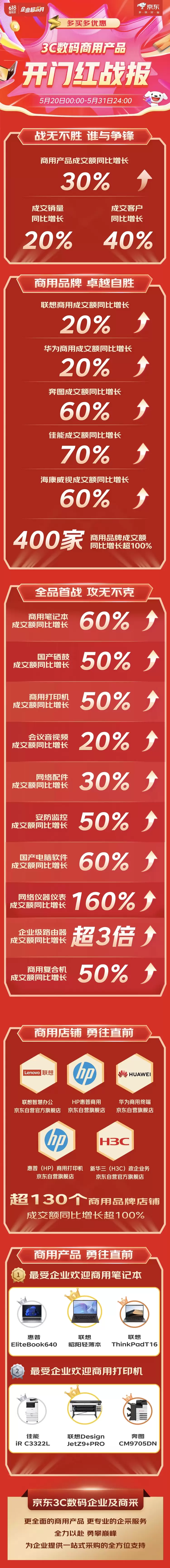凭借又便宜又好的购物体验,本次京东618激发了客户的换新热情,京东3C数码企业及商采618再创佳绩。5月20日至5月31日,3C数码商用产品成交额同比增长30%,成交销量同比增长20%,成交客户同比增长40%;笔记本、打印机等品类销售纪录不断刷新,为客户提供了“多买多优惠”的全新采购体验。