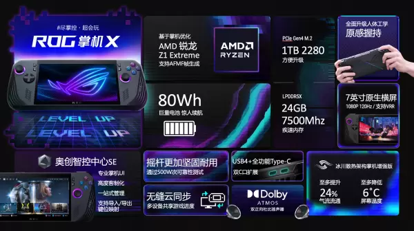 2024年6月2日Computex2024,ROG正式发布新款掌机——ROG掌机X。其在前代ROG掌机出色性能+舒适操控+凉爽散热+易用前端的基础上,再度实现多维度重磅进阶。作为全新登场的T0级掌机,ROG掌机X采用全新的黑色配色,电池容量突破至80Wh,续航得到大幅提升。人体工学经过全面改善,握持舒适度和操控体验均得到提升。配置方面,ROG掌机X采用AMD锐龙Z1 Extreme APU,7英寸1080P支持VRR的原生横屏,升级至2280标准长度1TBPCIe4.0SSD、24GB LPDDR5X内存。备受玩家好评的奥创智控中心SE也更新至1.5版本,采用全新界面,并提供多项优化。内部架构重新设计,双风扇三出风口,散热效率提升,屏幕温度和噪音更低。,同时加入USB4接口,和全功能Type-C组成双C接口,带来更快速、更丰富的拓展可能,满足各种游戏所需,为不同玩家提供“尽掌控 超会玩”般的畅爽掌上游戏体验。