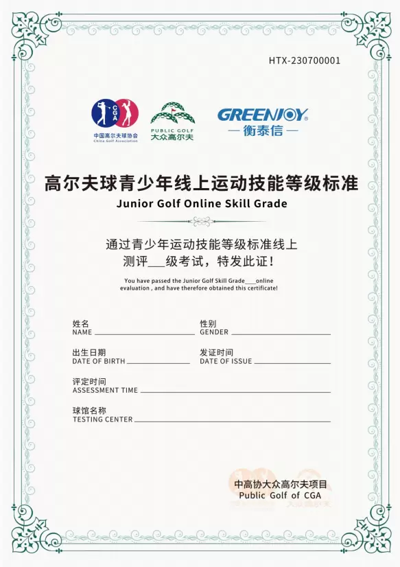 衡泰信模拟器内上线的《中高协大众高尔夫球青少年线上运动技能等级标准》,是目前高尔夫行业内核心的测评项目之一,全面覆盖了“三阶九级”的体系标准。通过衡泰信模拟器,武汉的高球少年们可以突破武汉线下考级只能考到1-4级的限制,在衡泰信模拟器上就能完成从1级到9级的全面考核。不仅如此,完成考级后,考生还将获得中高协认证的证书。