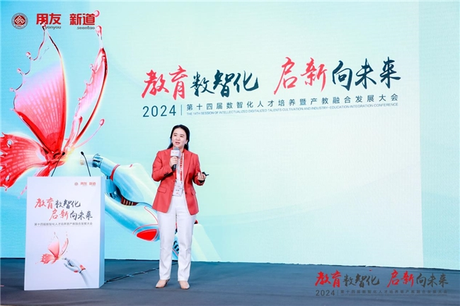 江西应用科技学院常务副校长干甜以“落实三元育人,践行产教融合八共,共谋高质量特色发展”为题作了演讲。干校长分享了江西应用科技学院在产教融合和人才培养方面的探索实践,提出了"八共"合作路径,即:专业共设、教材共编、基地共建、就业共助、方案共制、教学共施、师资共培、成果共享,并指出在与用友新道的合作中,双方共建了数智财经产业学院,在人才培养方案修订、教材编写、师资培训等方面进行了全方位的融合。通过这种产教深度协同,学校培养的学生不仅具备扎实的专业理论功底,还用友较强的实践技能和创新意识,在就业市场备受青睐。