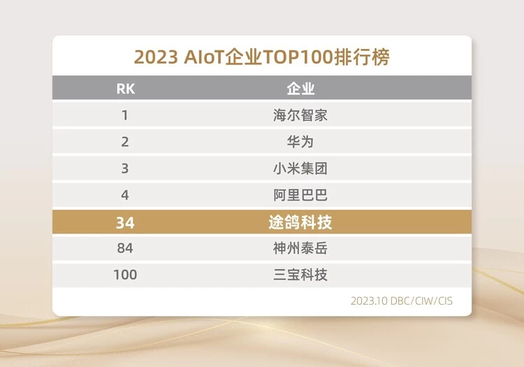 持续攀升!途鸽科技荣获“2023中国AIoT百强企业”TOP34