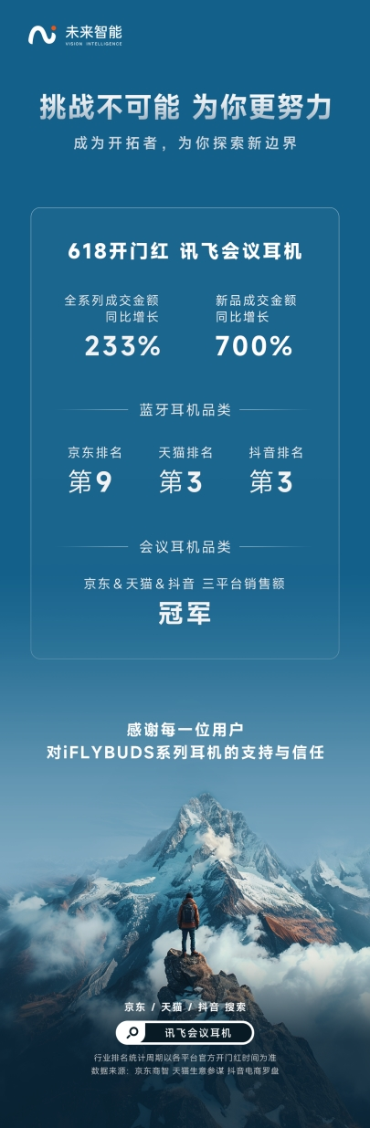 6月2日,人工智能硬件公司未来智能公布了618开门红战报,包括新一代讯飞会议耳机Pro 2和iFLYBUDS 2等新品,在618大促开门红中,其全系列成交金额同比增长233%,新品成交金额同比增长700%。在各大电商平台蓝牙耳机大品类排名中,讯飞会议耳机位居京东排名第9、天猫排名第3、抖音排名第3,而在会议耳机细分品类中,讯飞会议耳机则当之无愧为三大电商平台销售额冠军。