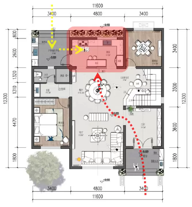 以厨房场景为例,乡村生活中需要杀鸡宰鱼、清洗带泥土的蔬菜瓜果等,所有户型的厨房都开侧门,外接户外加工平台,主人可以在户外平台对食材进行粗加工处理后再转至厨房进行处理。