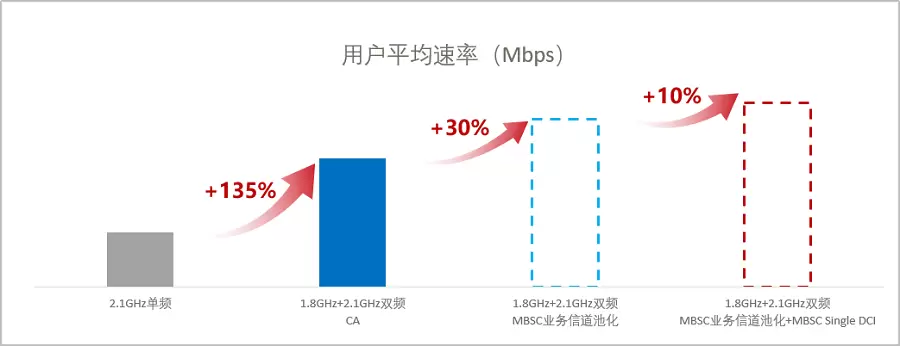 现场测试显示,1.8GHz+2.1GHz双频大带宽NRCA,与2.1GHz单载波40MHz相比,下行速率显著提升了135%。随着支持NR CA的终端在现网中的比例增加,MBSC业务信道资源池化功能激活后,预计下行速率将进一步提升30%。此外,随着R18终端逐步引入对MBSC Single DCI的支持,随着R18终端比例的增加,下行速率将再次提升10%。