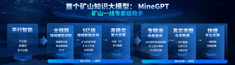 中科慧拓MineGPT具体由L1 层矿山领域大模型 和 L2 层场景大模型组成,L1 层是连接通用大模型与矿山场景的适配器,在训练过程中,依托中科慧拓,以及与合作伙伴在矿山领域长年累月积累的矿业工作流,使它具备丰富的领域知识,从而能更好、更快的支持智能场景化智能开发。L2层是矿山一线的“专家级助手”,利用利用GenDS产生的高质量数据进行训练,打造出专、精、准的场景模型。