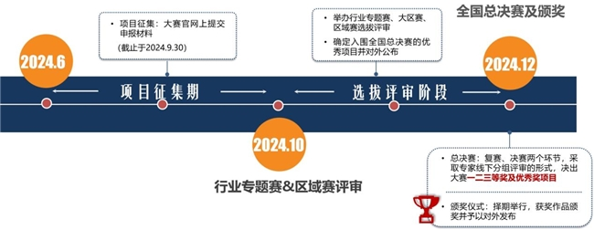 大赛将历经项目启动、项目征集、选拔评审、颁奖仪式四个阶段,拟于2024年12月份完成总决赛的评审,发布最终获奖名单。