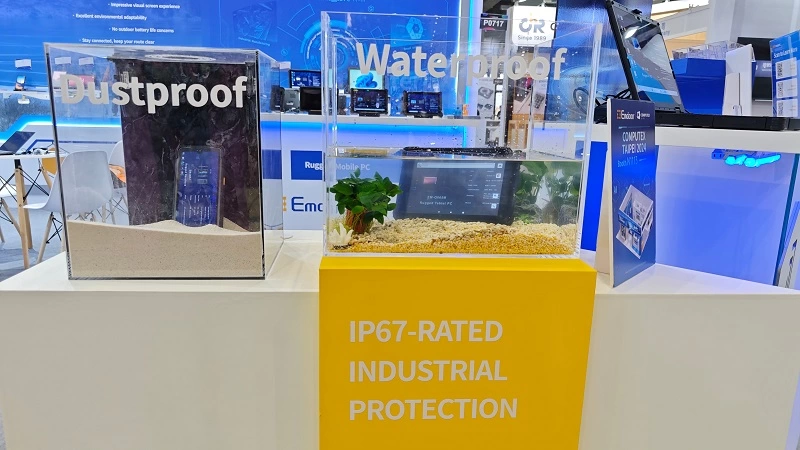 值得一提的是,现场防尘和防水展示区吸引了众多观众驻足参观。加固计算机作为亿道三防区别于消费类智能终端的核心产品,其对防尘、防水均有较高要求。对此,亿道三防加固计算机采用强固式设计,不仅通过IP67/IP65认证,可在1米深的水中浸泡长达约30分钟,还完全按照坚固耐用的MIL-STD-810H/810G标准制造,可抵御冲击、振动、极端温度和1.22米高的跌落而不会损坏或中断。