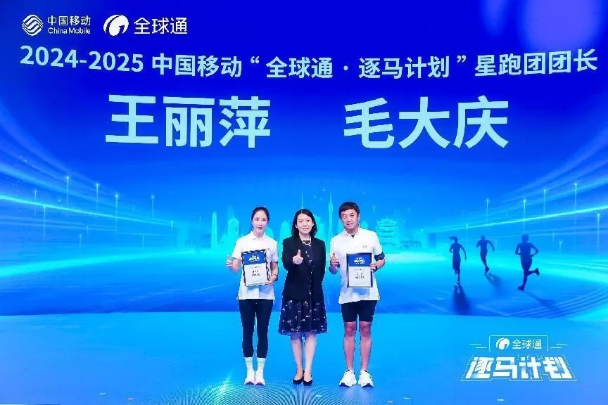 发布会现场,由奥运冠军王丽萍、中国探险协会百马跑者分会会长毛大庆,以及全国冠军、中国马拉松运动员李芷萱等跑马大咖组成的“全球通·逐马计划”星跑团惊喜亮相,中国移动正式授予王丽萍、毛大庆“星跑团团长”称号,这支横跨多领域的全明星跑团,将陪伴大家“移”起超越自我、探索无限可能。