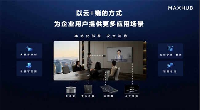 段宇表示,会议信息始终是企业内部相对核心的机密信息,大家对安全性有一定的顾虑,MAXHUB推出的高效会议解决方案,通过精简大模型参数,辅以本地化部署的智能终端,完成了端侧离线处理的能力构建,进而以这种“云+端”的方式,为企业用户提供更丰富的、安全的场景化应用方案。