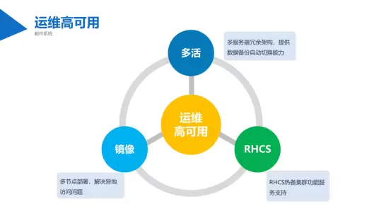 Coremail邮件系统历时25年,把不同的功能模块化,最大程度地减少系统的数据冗余,增强系统的稳定性和运作性。系统采用分布式部署架构,最大地避免系统宕机,保障了整个邮件系统的系统安全。