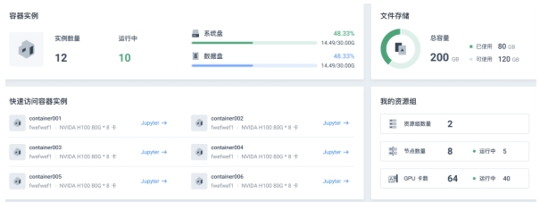平台通过统一的集群管理,实现对 NVIDIA、国产 GPU 等多种异构算力的高效调度。无论是高速 IB、RoCE 网络建设,还是并行文件存储集群管理,平台均能提供从物理机到容器的全方位管理。新版平台支持共享 GPU、单卡、多卡、多节点的算力调度,用户可根据实际业务需求按需申请使用,极大地提高了算力资源的使用效率。