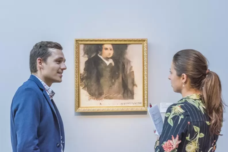 在佳士得的伦敦市中心画廊的白墙上,挂着一个金色的画框,画中是一个穿着清教徒式的黑色衣服,看起来有些犹豫的男子——这幅画似乎是某位古代大师的作品。但在它的右下角却有一个让人意想不到的签名:一个数学方程式。