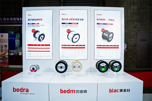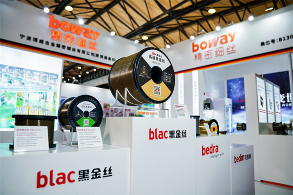 除博威合金模具选材解决方案受到广泛关注外,博威细丝展台前同样人流涌动。作为更名后的首次线下展会,博威细丝高度重视此次展示效果。博威细丝拥有中、德两大研发生产基地,掌握多项制造技术,其生产的切割丝,主要应用于慢走丝机床加工,是模具加工和精密零部件加工的关键材料。作为第三批“国家级制造业单项冠军企业”,其研制的切割丝在行业内处于领先地位。此次参展,博威细丝带来了高速黑金丝 BWcut Fx、高效黑金丝BWcut H等多款行业颠覆性的切割丝解决方案,方案关注切割效率、加工效益和加工精度,通过“复合重构”技术革新,灵活匹配客户的多样化需求。