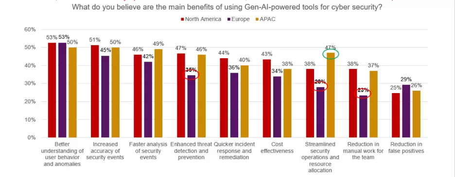 全球所有地区的受访者都表示,GenAI 工具可帮助更好地了解用户行为和异常情况。不过,对于 AI 技术能否提高效率,例如加强威胁防御和检测、简化安全运维和资源分配,以及减少团队的手动工作量,欧洲地区受访者的看法不太一致。近 50% 的亚太地区专业人士表示,GenAI 可简化安全运维和资源分配,这一比例在全球三大地区中位居首位。