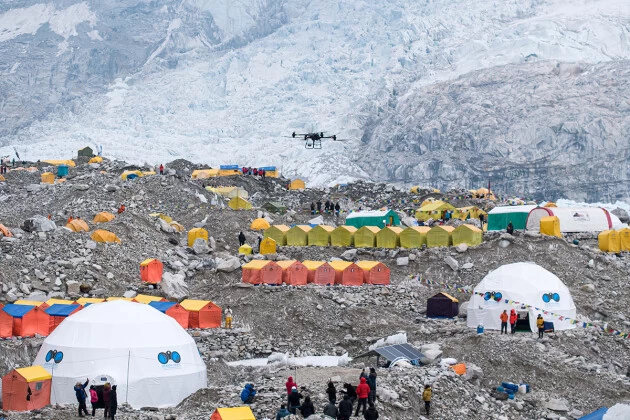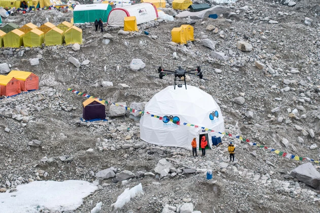 在珠峰南侧大本营(海拔5300米)及以上海拔地区,大疆运载无人机团队经过一周的艰苦测试,克服了高原反应、气候地形复杂多变等不利条件,最终验证了大疆运载无人机FC30在高原环境下的稳定飞行能力和有效的物资运输能力。