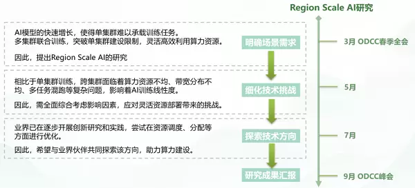 “Region Scale AI研究”项目旨在通过跨数据中心联合训练,突破单集群建设限制,灵活高效利用算力资源。未来几个月,ODCC将与业界针对Region Scale AI面临的技术挑战展开具体研究,探索技术方向,期望在年内形成研究成果,并在9月份ODDC年度大会进行成果发布。