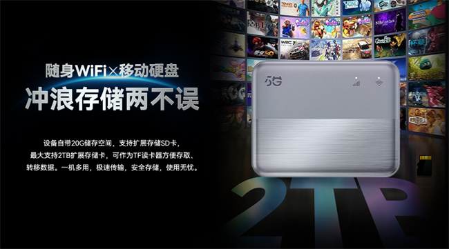 功能一:设备自带20G内置储存空间,并支持最大2TB的SD卡扩展存储。用户可以将其作为移动硬盘使用,通过TF读卡器方便地存取和转移数据,结合了数据存储和移动网络的功能。
