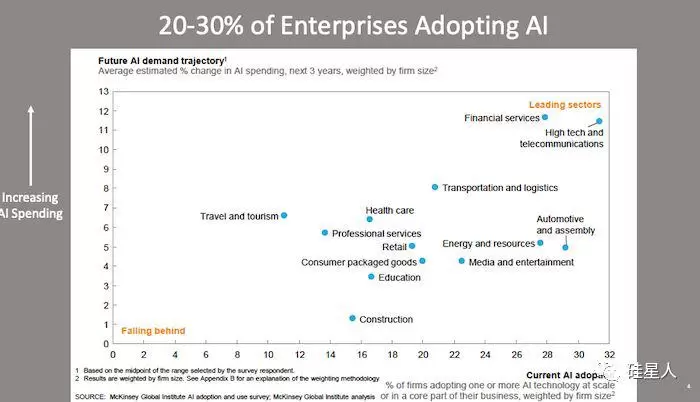根据麦肯锡全球AI投资和采用报告,全世界所有的大小公司目前只有两到三成正在使用各种形式的AI技术,其中很多公司都处在特定行业,如金融和高科技信息等,其他行业目前相对落后。如下图显示,旅游业AI投入增加明显(纵轴),但采用的公司比例较少(横轴 %)而建筑业采用的比例有很大提升,全行业在AI方面的投资却不足。
