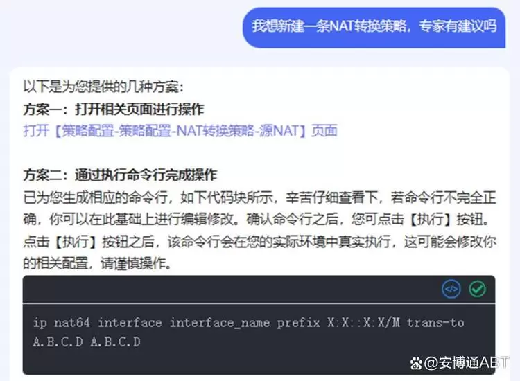 将自然语言翻译成防火墙命令,解决海量命令行难记忆的惆怅,防火墙可定位到对应的配置页面,或直接生成命令行,确认或修改后即可下发。