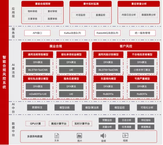● 智能合规风控平台的第一大能力域为全流程智能质检,覆盖了推广、运营、投研、营销、服务、售后六大业务维度的行为记录、沟通记录等多类型数据,实现了海量数据的全链路数字化留痕。还可对专业内容进行智能检查,识别潜在违规点、违规类型并预警,大幅提升合规审核效率。