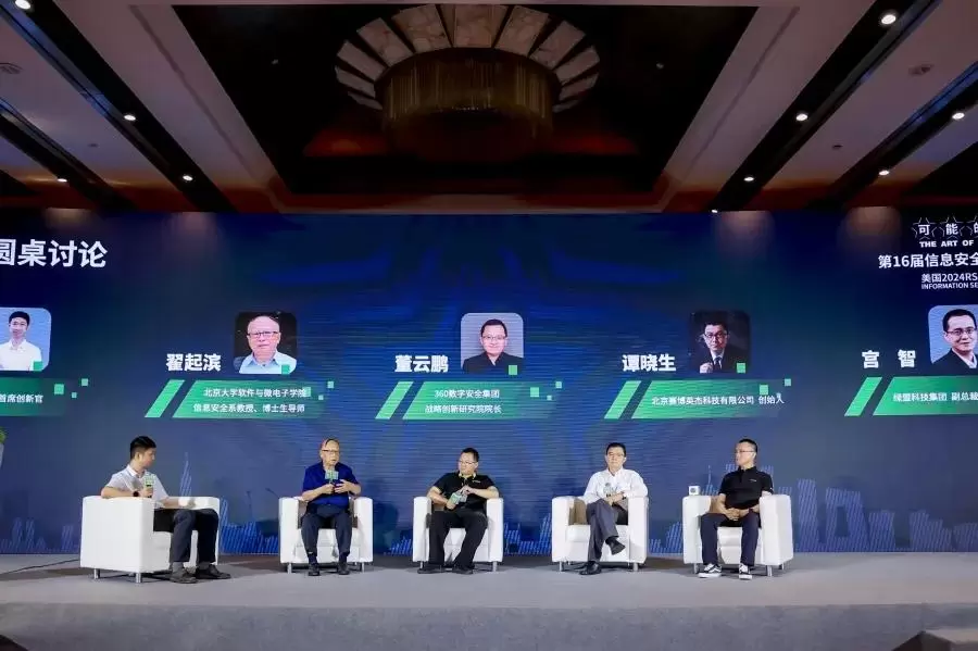 在大会设置的圆桌对话环节,主持人绿盟科技首席创新官刘文懋,与绿盟科技集团副总裁宫智,360数字安全集团战略创新研究院院长董云鹏,北京大学软件与微电子学院信息安全系教授、博士生导师翟起滨以及北京赛博英杰科技有限公司创始人谭晓生等嘉宾,围绕2024 RSA大会主题、网络安全领域AI趋势走向、国内外安全产业差异等话题开展深度对话。