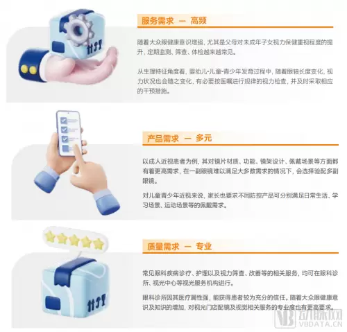 用户消费行为习惯:根据美团平台的数据,验光/配镜/近视眼手术是线上主要需求,其中干眼症增速快。