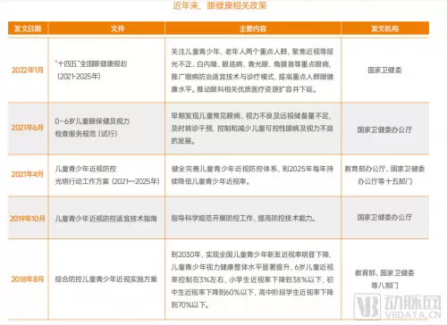 2018年,教育部、国家卫健委等八部门联合印发《综合防控儿童青少年近视实施方案》,提出了到2023年近视防控目标:6岁儿童近视率控制在3%左右,小学生近视率下降到38%以下,初中生近视率下降到60%以下,高中阶段学生近视率下降到70%以下。此后,国家卫健委又发布了近视防控的服务规范、技术指南的文件。