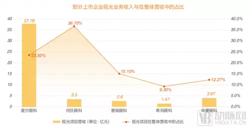 根据各大上市公司年报披露,2022年,爱尔眼科、何氏眼科、普瑞眼科、希玛眼科、华厦眼科的视光服务项目分别占到了营收的23.50%、36.70%、15.10%、9.30%、12.27%,成为营收重要增长极和支撑点。