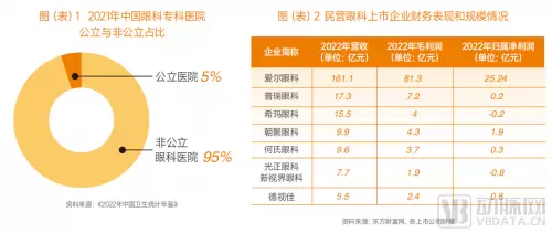 眼科医疗在公立综合医院多隶属于五官科,整体投产比和重视程度较低,在公立体系中如北京同仁医院、广州中山眼科中心、上海复旦耳鼻喉医院、温州医科大学附属眼视光医院等综合实力较为强劲。《2022年中国卫生统计年鉴》显示,2021年我国眼专科医院有1203家,其中公立眼科医院仅有59所,非公立眼科医院数量近乎接近20倍,多达1144家。