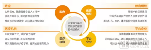 社会各方将通过大数据平台进一步加深配合,实现多方联动,构建儿童青少年视觉健康防控联盟,其中联盟主体中政府将加强顶层设计与相关措施推行,完善儿童青少年视觉健康筛查:家长将随着重视程度的加深为孩子购买各类产品及服务,全方位进行近视防控:学校作为孩子校内生活的主要责任方,将加强户外锻炼,在信息化教学的过程中对各类电子产品进行高标准管控;医疗机构将采取更多元的方式积极参与到视觉健康宣教中,提升自身的检查服务能力。同时,联盟外围各方主体,例如视觉相关人才培养机构、视觉健康产品厂家也会在人才输送、产品服务等方面对联盟的运行给予支撑。