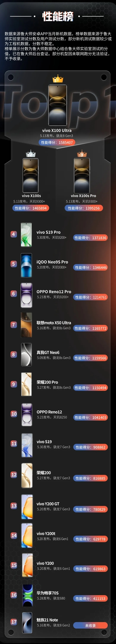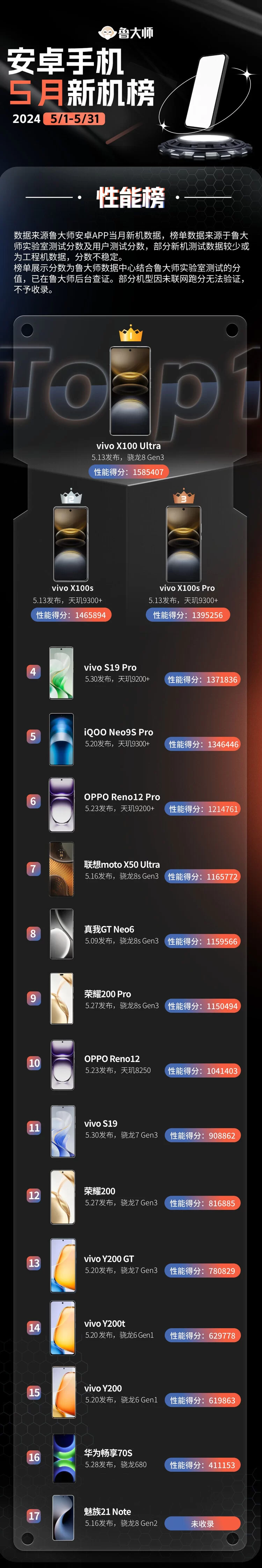 最终毫无疑问,vivo X100 Ultra以1585407分的总成绩,坐拥5月新机性能榜的榜首。