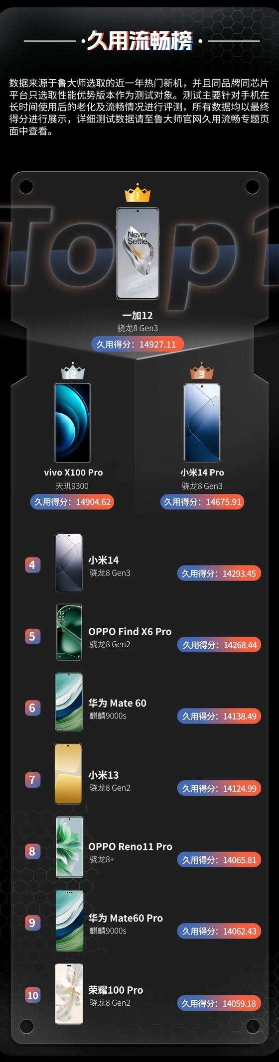 可以看到榜单的前六名中有5台设备都是搭载了OriginOS 4.0的设备,其中vivo的天玑9300+新品包揽了前三。毫无疑问,这是OriginOS 4.0和天玑9300+软硬件融合最佳化的结果。