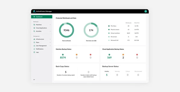 以往企业需要为各种不同设备与平台分别采购备份系统,ActiveProtect可以集中保护企业跨平台设备,包括物理环境、虚拟环境、数据库以及Microsoft 365等云端服务。IT 管理员可以在同一个操作界面中,为不同平台设备设置备份策略和任务,以此大幅提升整个企业的数据备份管理效率。