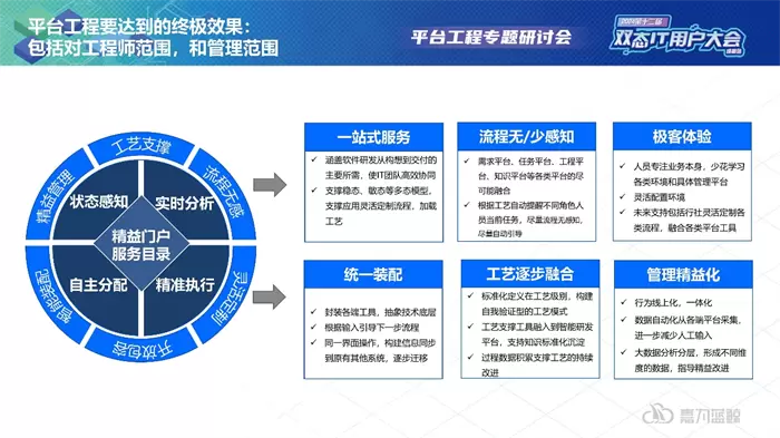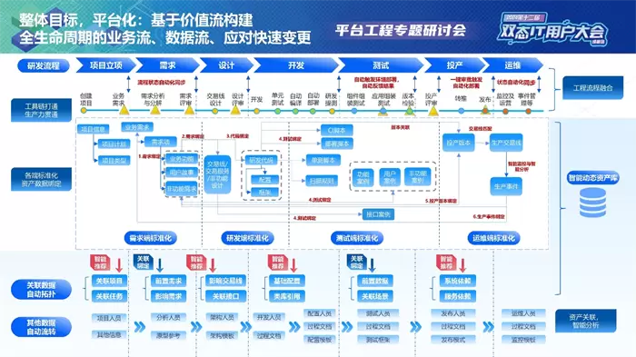 他提出了“基于精益价值流的平台化工程”的破局思路,强调将统一标准融入各工具平台,实现业务价值流与工程价值流的互联、互通、互锁。打通业务层和技术层,与具体工具平台、研发模式松耦合,将业务流程内聚化,做到可建模,可观测,可度量,形成业务与技术之间的高效联动和协同合作。