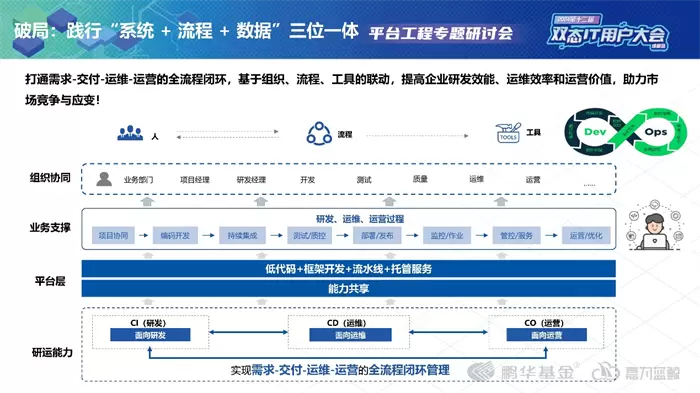 作为公募基金“老十家”公司之一,鹏华基金已发展成为超万亿规模的超大型专业资管平台,为支撑产品数量与管理规模的不断升级,鹏华基金将数字化转型纳入到发展战略。鹏华基金金融科技部副总经理李学森在演讲中表示:鹏华基金践行“系统+流程+数据”三位一体,通过建设一套平台化的架构体系,提供面向研发、运维、运营的 CI/CD/CO 全流程管理的一体化平台。
