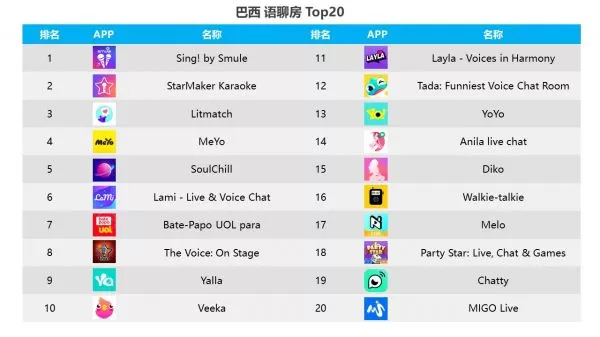 图:巴西语聊/K歌App收入Top 20