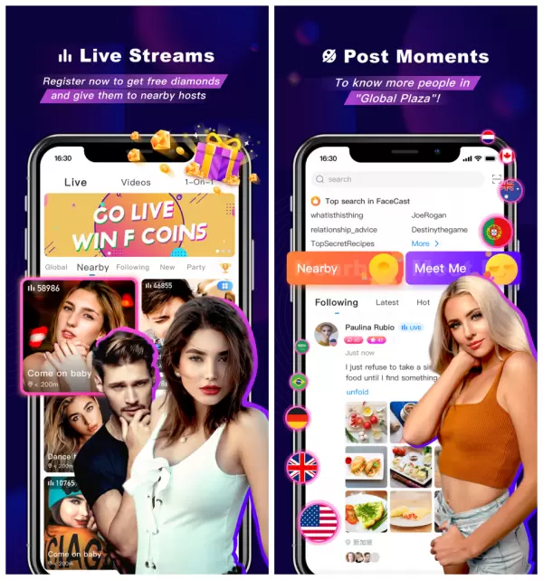 Facecast是在巴西等多个国家流行的视频交友平台,官方介绍称平台汇聚了全球150多个国家用户。平台以1v1随机匹配视频聊天玩法为主,还拥有短视频、直播等各类玩法,这也是国外很多主流社交App的产品形态。
