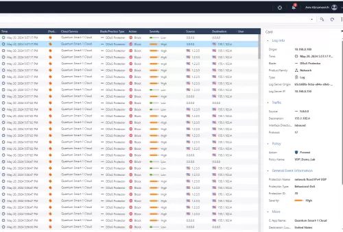 在统一仪表盘中查看来自 Quantum、CloudGuard 和 Harmony 的所有安全事件,包括来自新集成 DDoS Protector 的事件。
