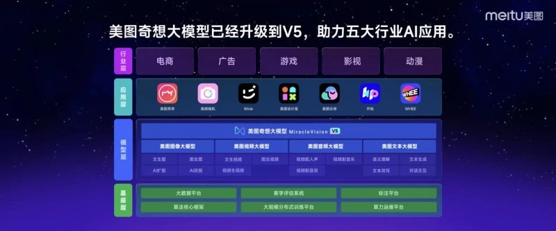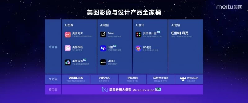 6款产品的发布进一步完善美图的AI产品生态。目前,美图的应用层有AI图像、AI视频、AI设计、AI营销四大模块,生态层由中国领先的视觉创意平台站酷和美图AI助手RoboNeo提供服务,模型层由美图奇想大模型(MiracleVision)为全系产品提供AI模型能力。