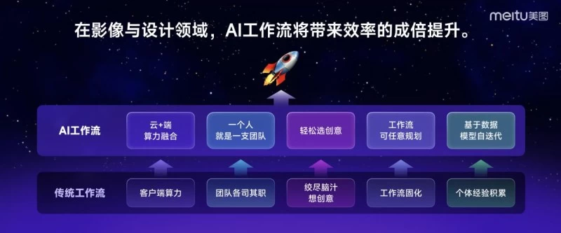 参与到这场竞争中的美图公司,选择了更为聚焦的道路,专注于AI工作流的深度开发和创新。吴欣鸿介绍说,相比传统工作流,AI工作流具备五大优势:云+端的算力融合、一个人就是一支团队、轻松选创意、工作流可任意规划、基于数据模型自迭代。