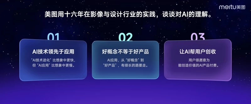 结合美图的应用实践,吴欣鸿分享了三个观点:第一,目前AI技术领先于AI应用,AI应用比想象中慢不少;第二,好概念不等于好产品,将AI概念转化为优秀产品的并不多;第三,要让AI帮用户创收,对于能创造价值的AI产品,用户是愿意付费的。