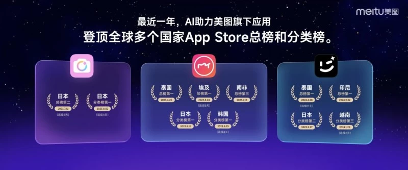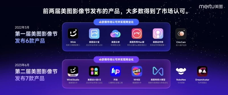 过去两届美图影像节,美图发布的AI产品已得到用户和市场的认可,多次登顶日本、韩国、泰国、越南等国App Store总榜第一。此外,美图设计室全年收入过亿,Wink是视频工具赛道第二名,美图证件照是在线证件照赛道第一名,开拍是口播创作工具赛道第一名。
