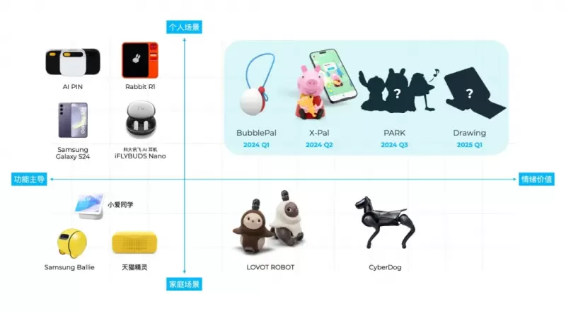 李勇:我们不认为AI+硬件领域的所有参与者都是相互竞争的。AI是一种基础设施,而硬件是一个广泛的范畴。从商业角度来看, 竞争更多出现在对同一人群、同一场景的争夺。比如说,像 AI Pin 和 Rabbit R1 这样的产品,我们并不认为它们是我们的竞争对手。同样,也很难想象大模型公司会去做毛绒玩具,或者玩具公司去做大模型应用。AI 毛绒玩具,我们的创业方向,还处在一个巨头看不上的市场。高峰:我认为产品可以按横纵轴分布。横轴上,左边是功能型产品,右边是情绪陪伴型产品。纵轴上,上面是个人使用,下面是家庭场景。把所有品牌的硬件类产品都放进这个框架里,天猫精灵、小爱同学,即使使用了大模型,也属于左下角的功能家庭产品;AI pin 和 rabbit 这样的产品属于个人功能性,位于左上角;大型机器人和机器狗则在右下角,提供情绪陪伴;剩下的就是我们这个产品,位于右上角,提供个人的情绪陪伴。
